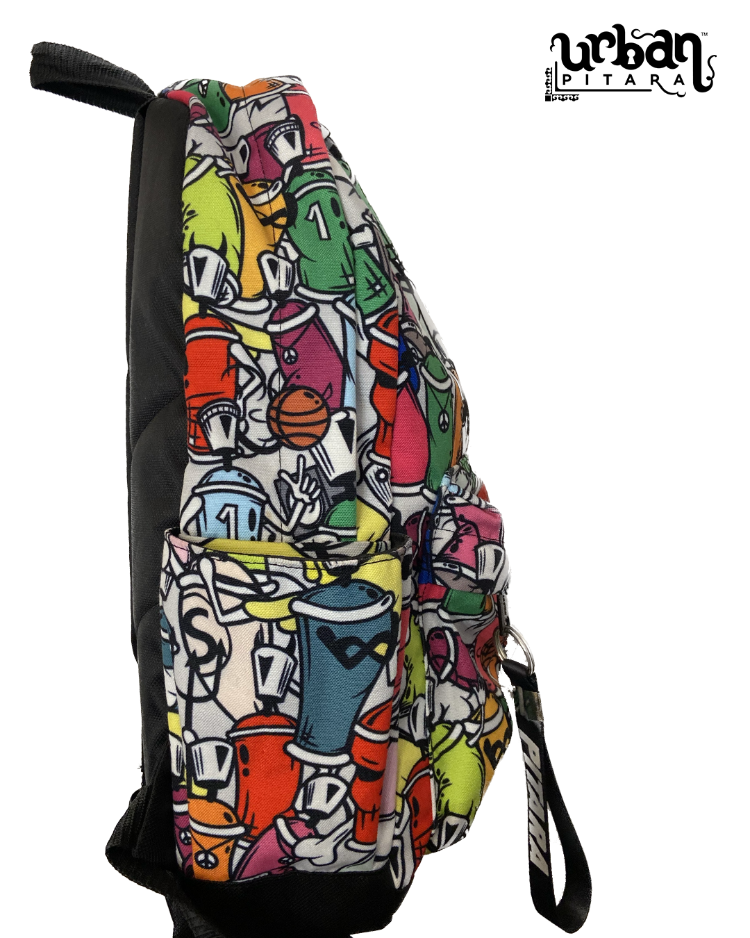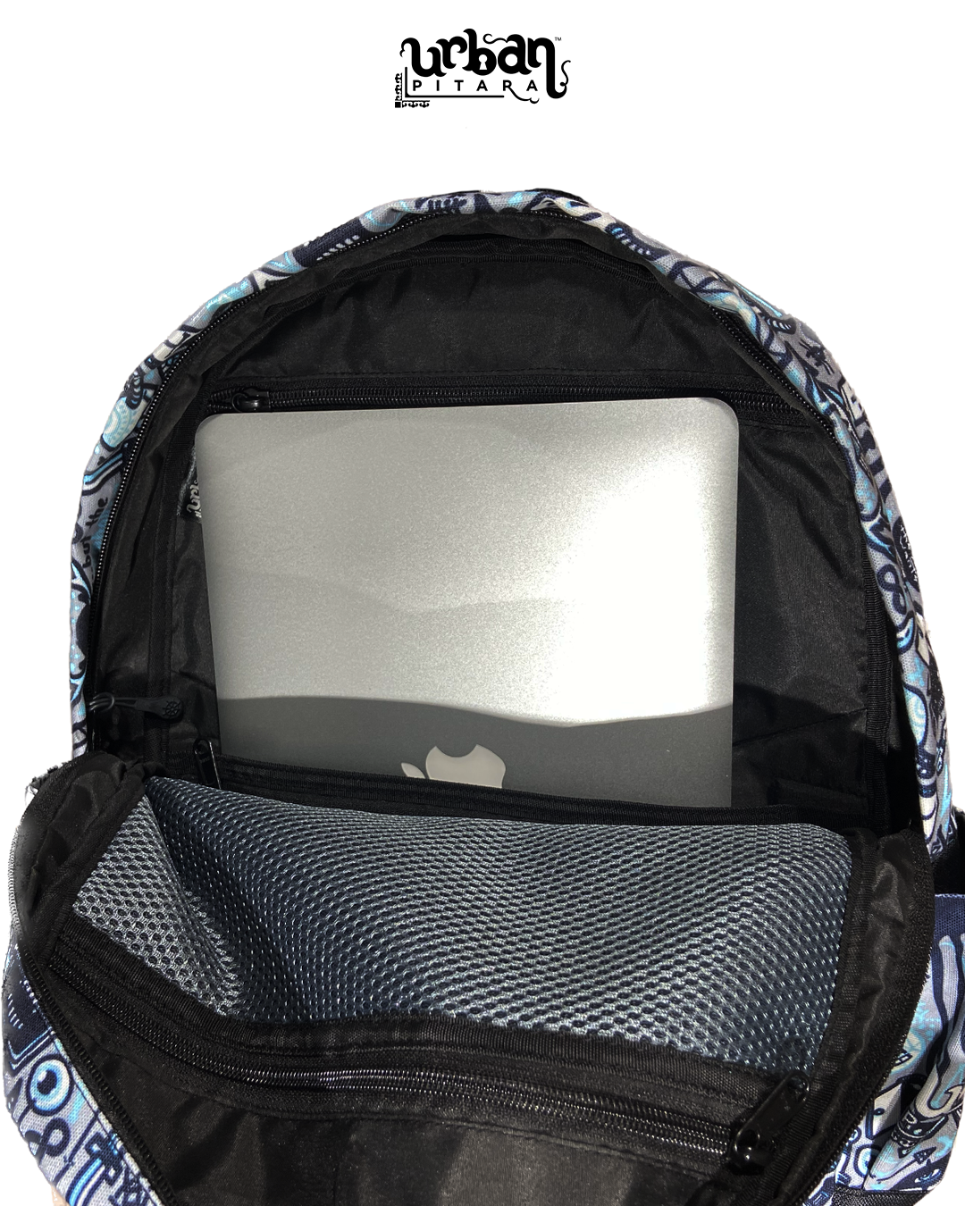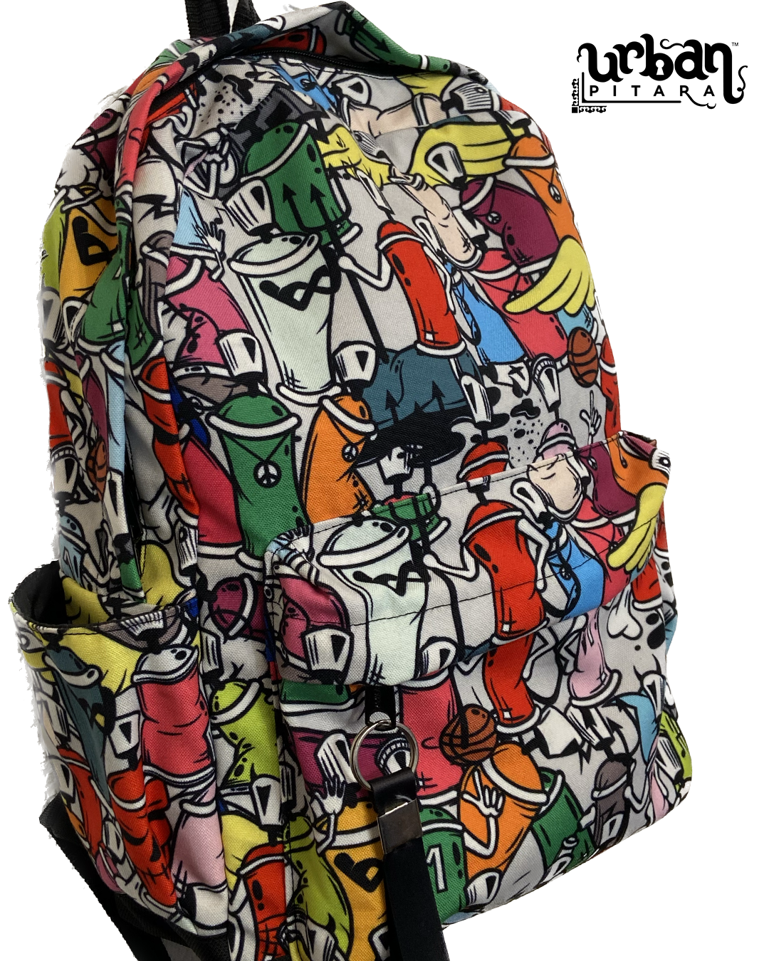 Urban Pitara Backpacks 1. Digitally Printed 2. Canvas Bags 3. Washable 4. With Laptop Sleeve inside 5. Bottle Holders on both sides 6. Size of bag is 18"x 16" x 4.5" (Size in inches) 7. Backside is Solid Black Colour NOTE: Internal images are for size reference only, print will be same as 1st picture.Urban Pitara Backpacks