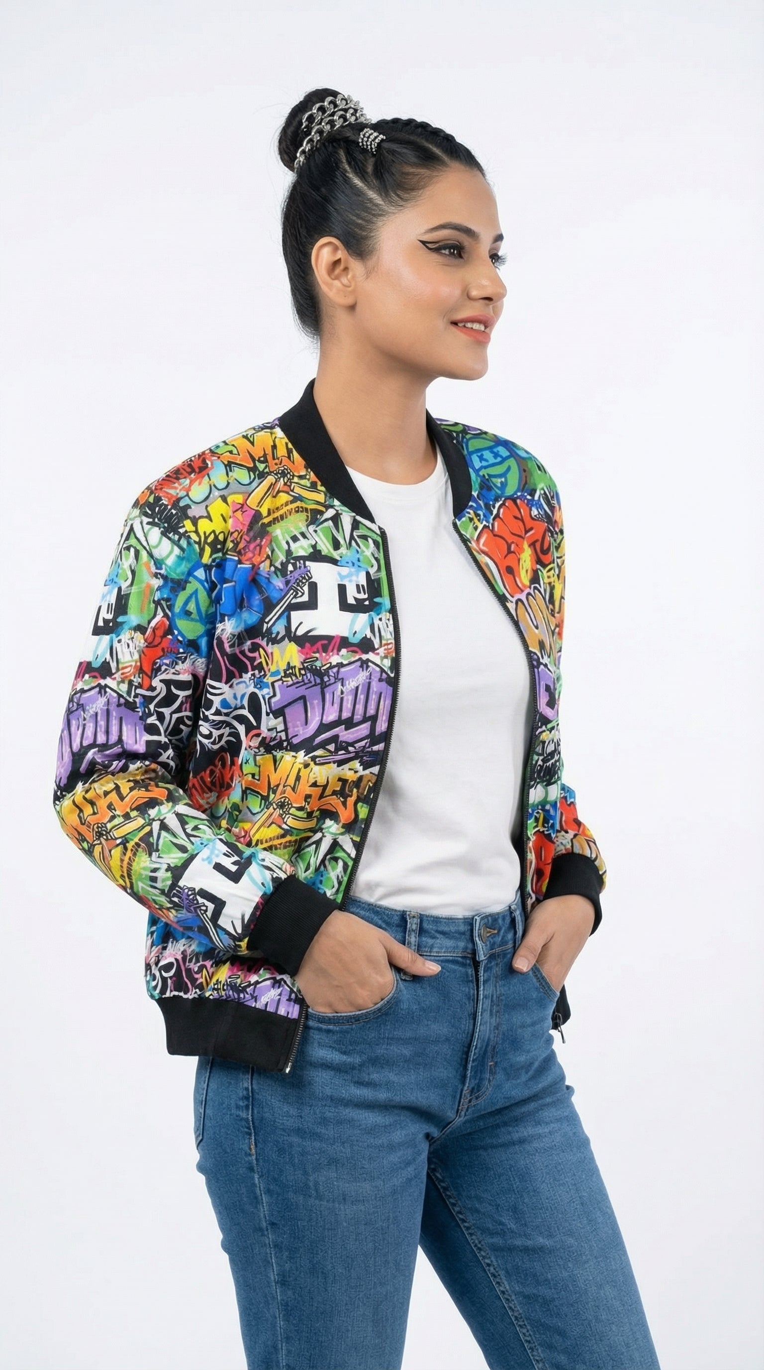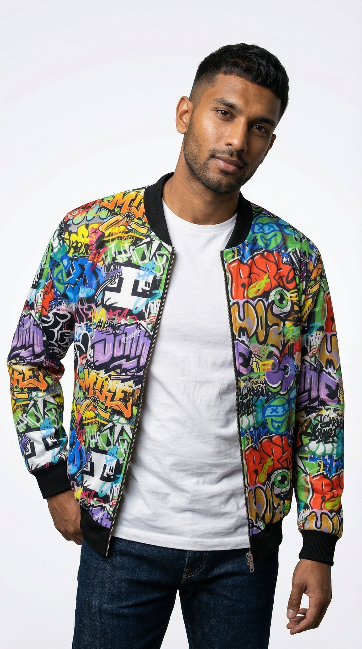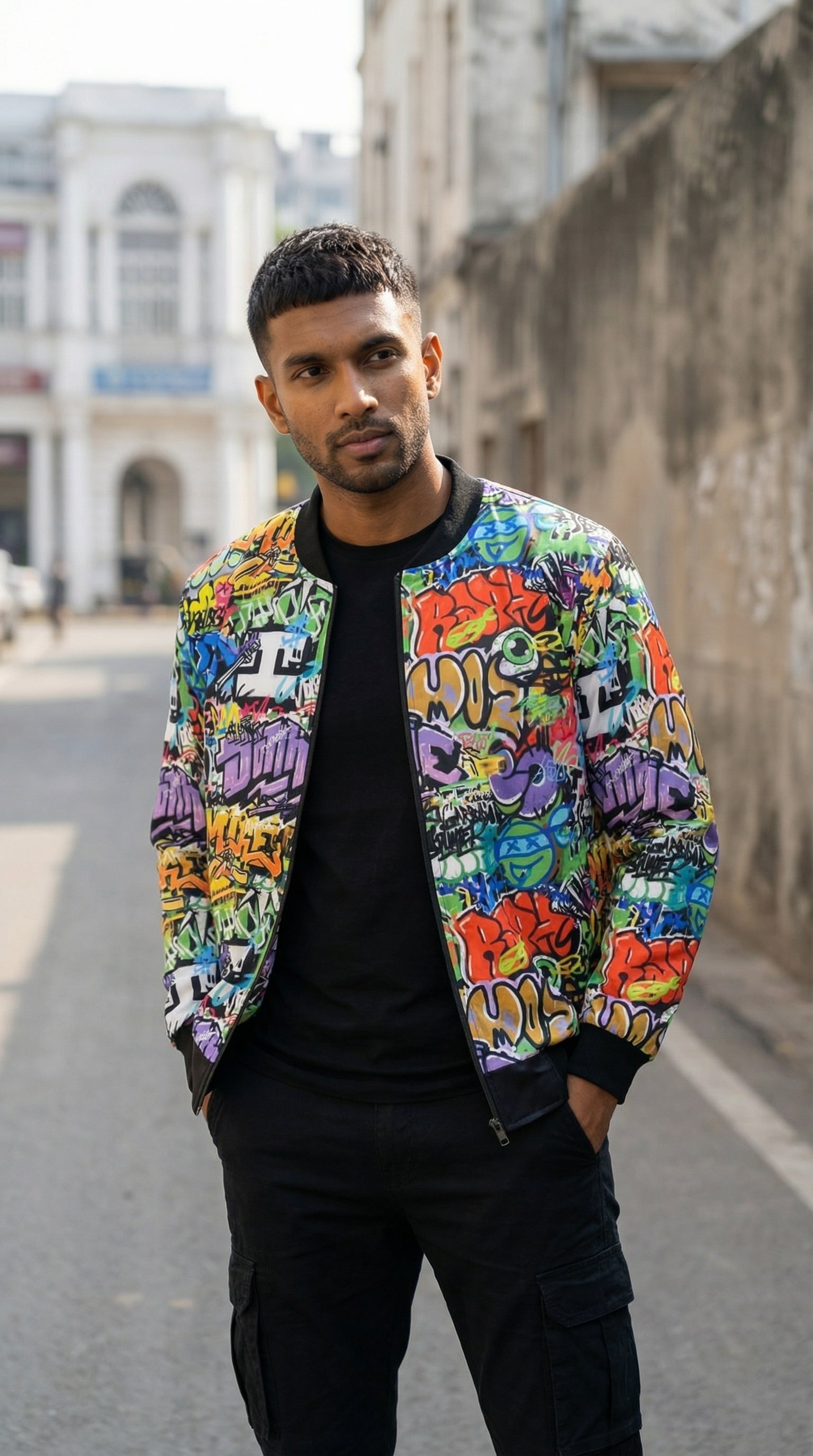 Introducing the Urban Pitara Bomber Jacket: digitally printed in high definition. Whether you're hitting the club scene or the streets, this lightweight and durable jacket is the perfect mix of warmth and comfort. Ideal for achieving that airport-ready look! Available in Two Special Fabrics All-Season ( Diagonal Fabric) Winter Fleece (For North Indian winters) More Details: Full Sleeves Regular Fit Full Front Open Zipper Style Two Side Pockets Ribbed Collar, Sleeves and WaistIntroducing the Urban Pitara Bomber Jacket: digitally printed in high definition. Whether you're hitting the club scene or the streets, this lightweight and durable jacket is the perfect mix of warmth and comfort. Ideal for achieving that airport-ready look!