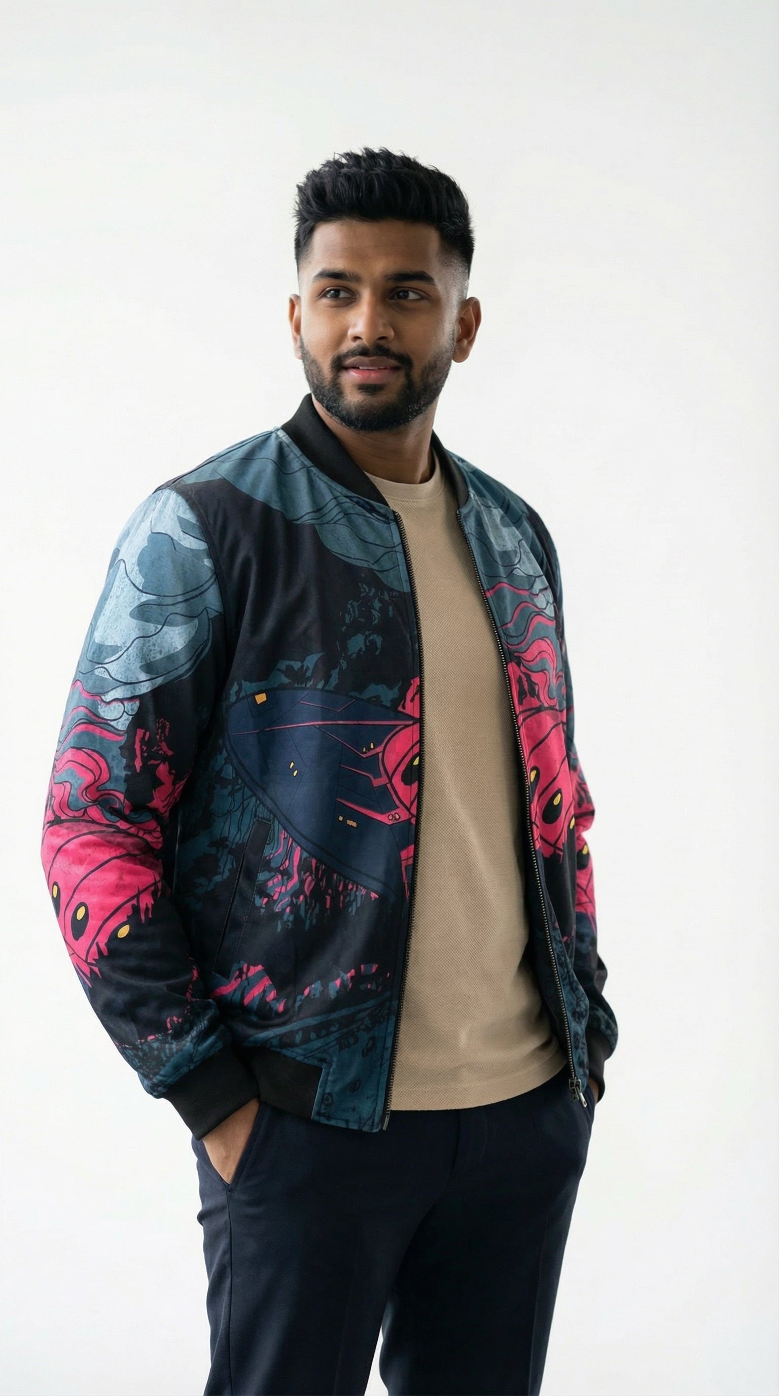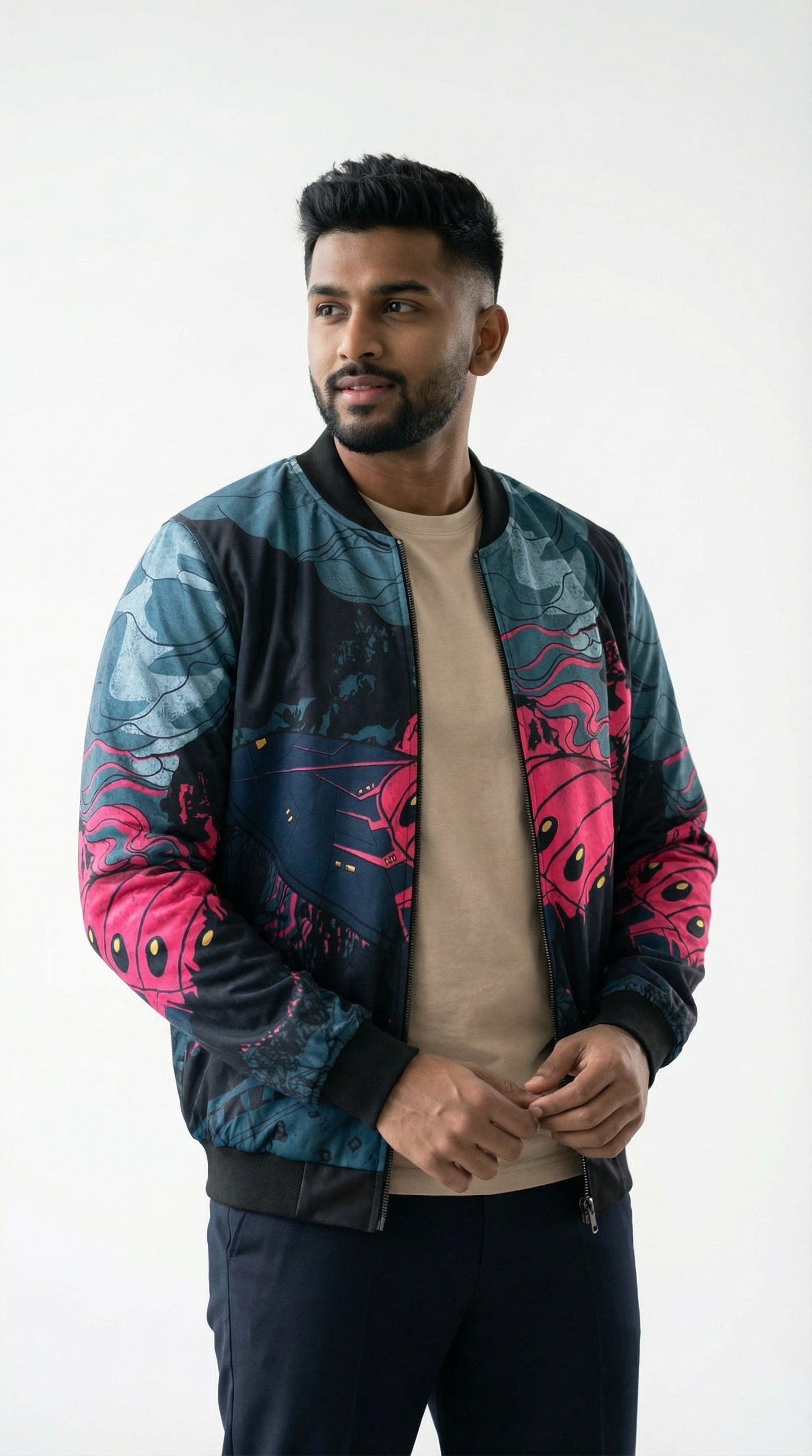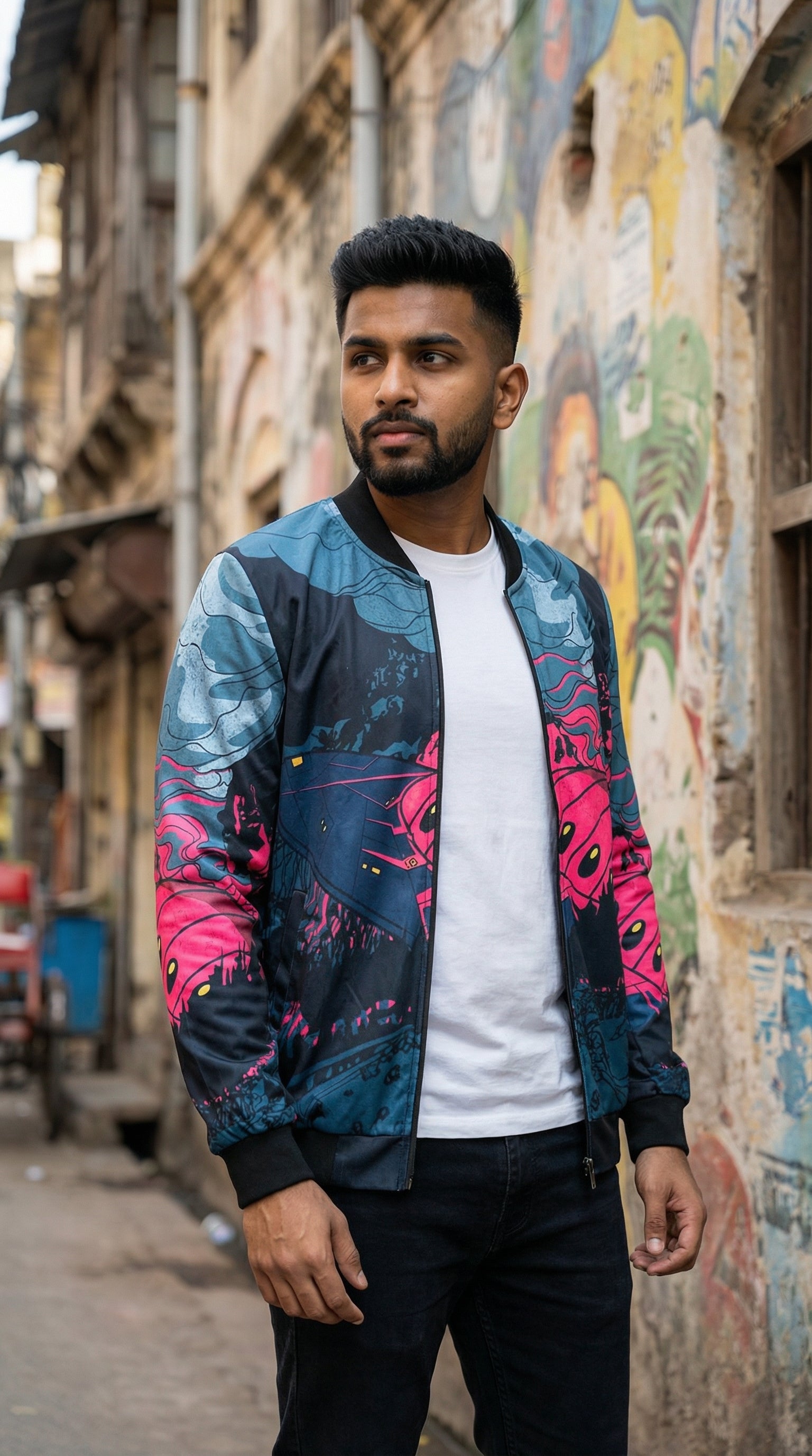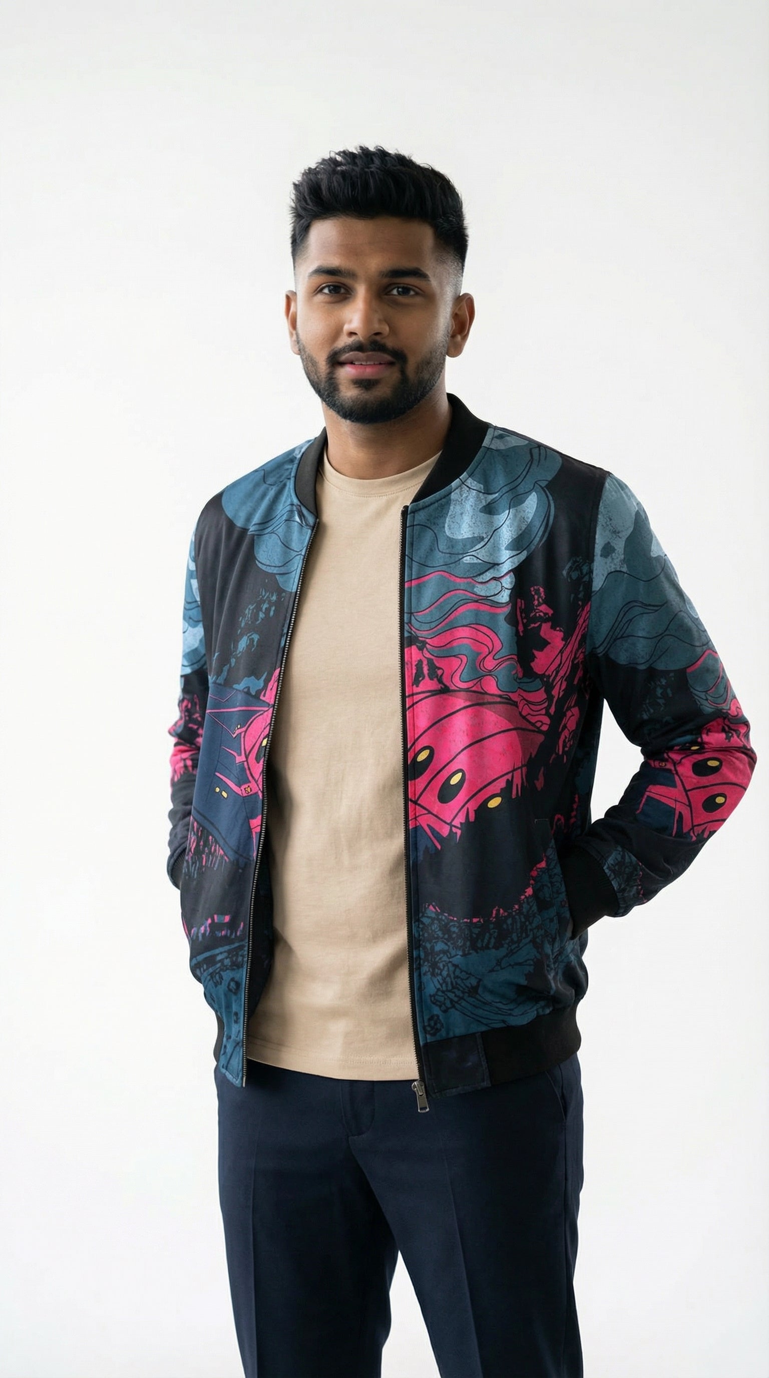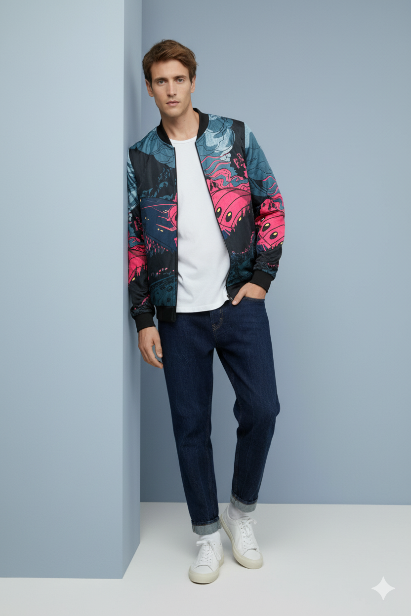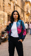 Introducing the Urban Pitara Bomber Jacket: digitally printed in high definition. Whether you're hitting the club scene or the streets, this lightweight and durable jacket is the perfect mix of warmth and comfort. Ideal for achieving that airport-ready look! Available in Two Special Fabrics All-Season ( Diagonal Fabric) Winter Fleece (For North Indian winters) More Details: Full Sleeves Regular Fit Full Front Open Zipper Style Two Side Pockets Ribbed Collar, Sleeves and Waist