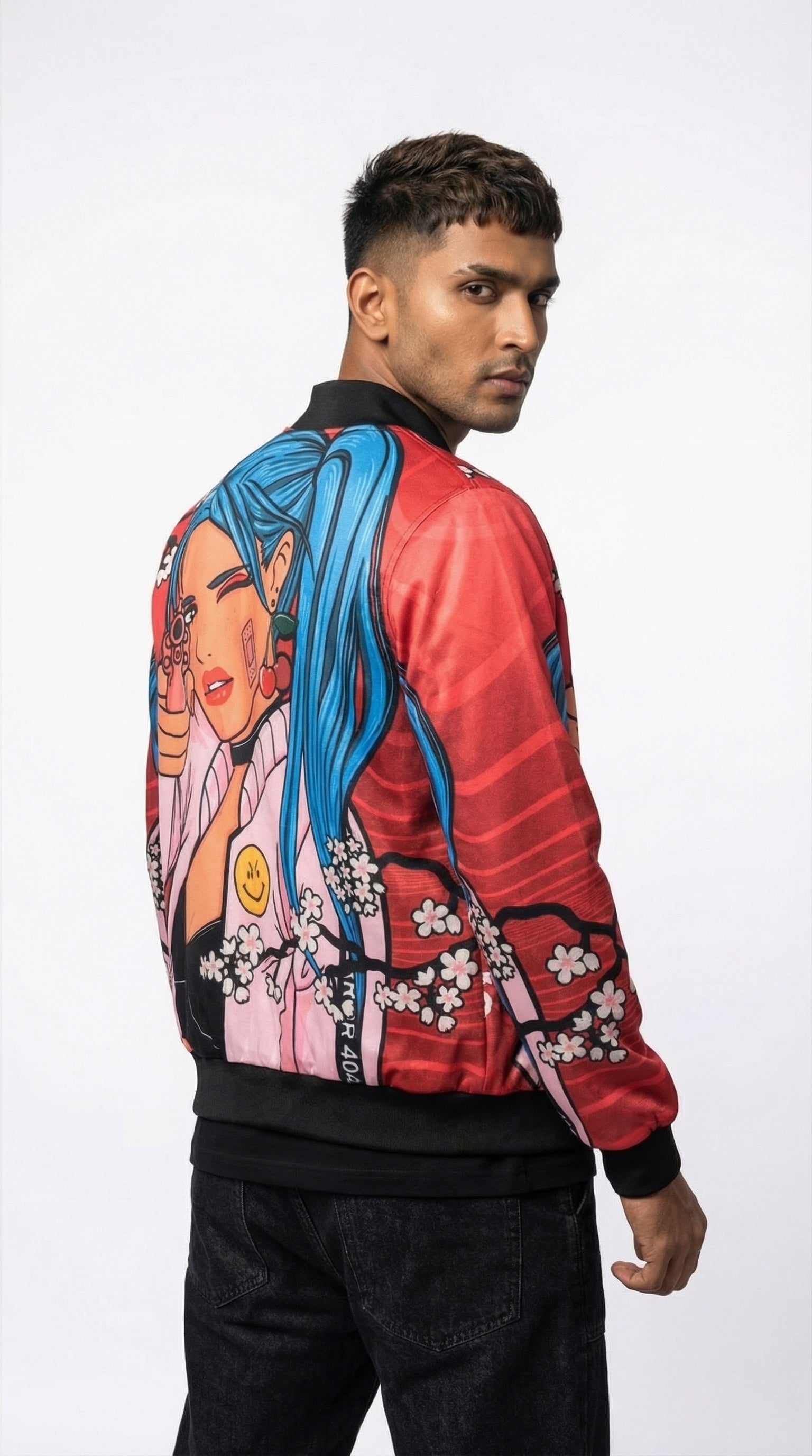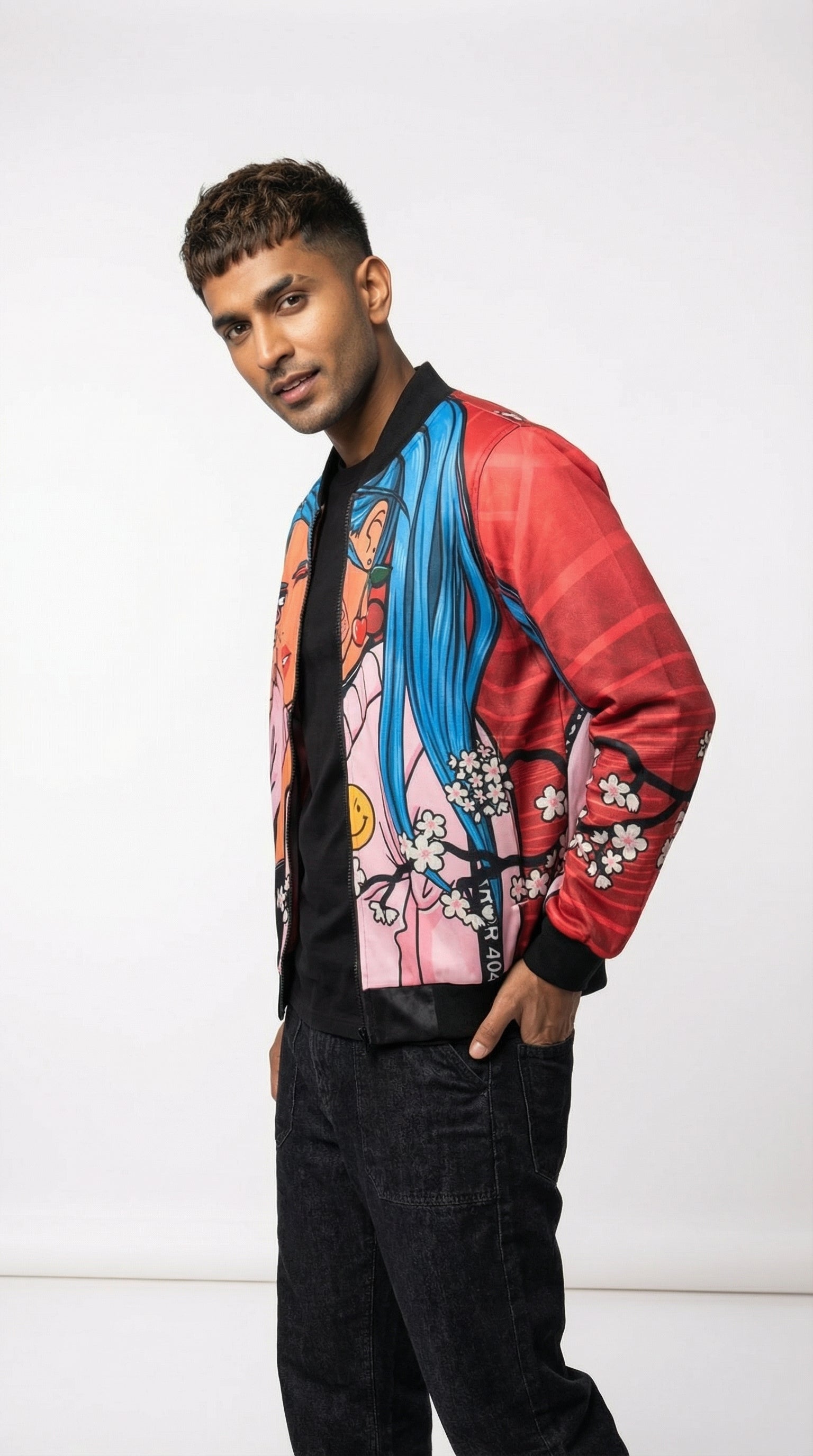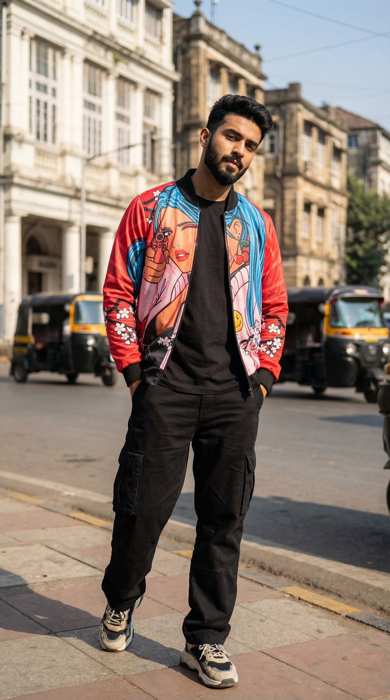 Introducing the Urban Pitara Bomber Jacket: digitally printed in high definition. Whether you're hitting the club scene or the streets, this lightweight and durable jacket is the perfect mix of warmth and comfort. Ideal for achieving that airport-ready look! Available in Two Special Fabrics All-Season ( Diagonal Fabric) Winter Fleece (For North Indian winters) More Details: Full Sleeves Regular Fit Full Front Open Zipper Style Two Side Pockets Ribbed Collar, Sleeves and Waist
