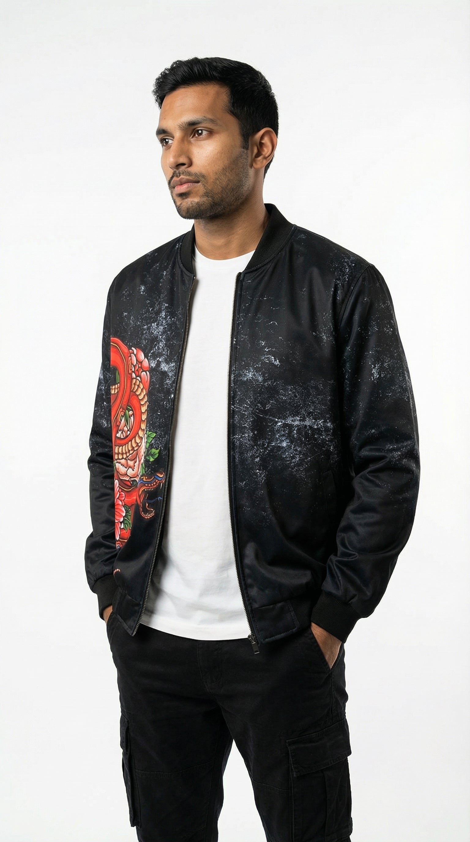 Introducing the Urban Pitara Bomber Jacket: digitally printed in high definition. Whether you're hitting the club scene or the streets, this lightweight and durable jacket is the perfect mix of warmth and comfort. Ideal for achieving that airport-ready look! Available in Two Special Fabrics All-Season ( Diagonal Fabric) Winter Fleece (For North Indian winters) More Details: Full Sleeves Regular Fit Full Front Open Zipper Style Two Side Pockets Ribbed Collar, Sleeves and Waist