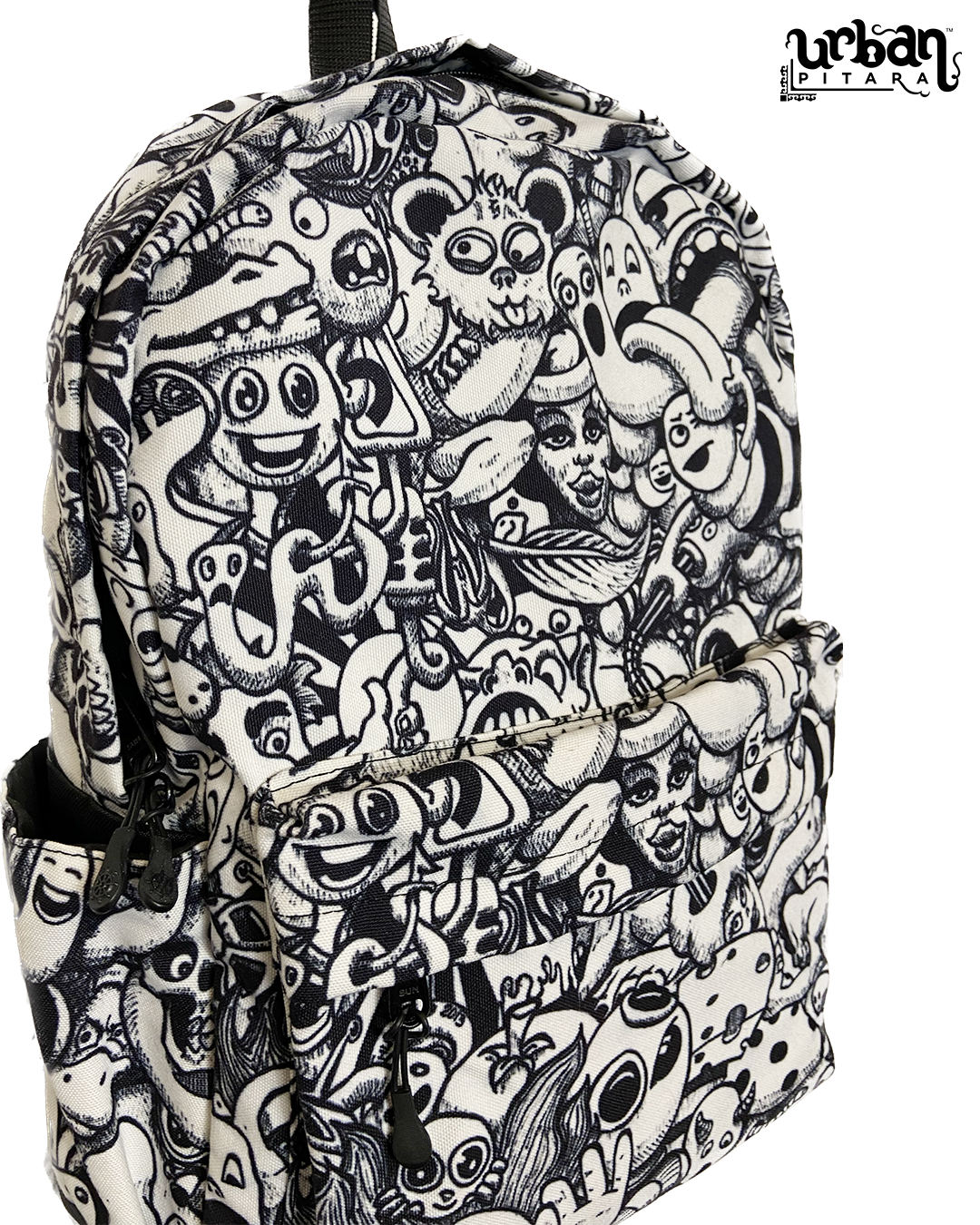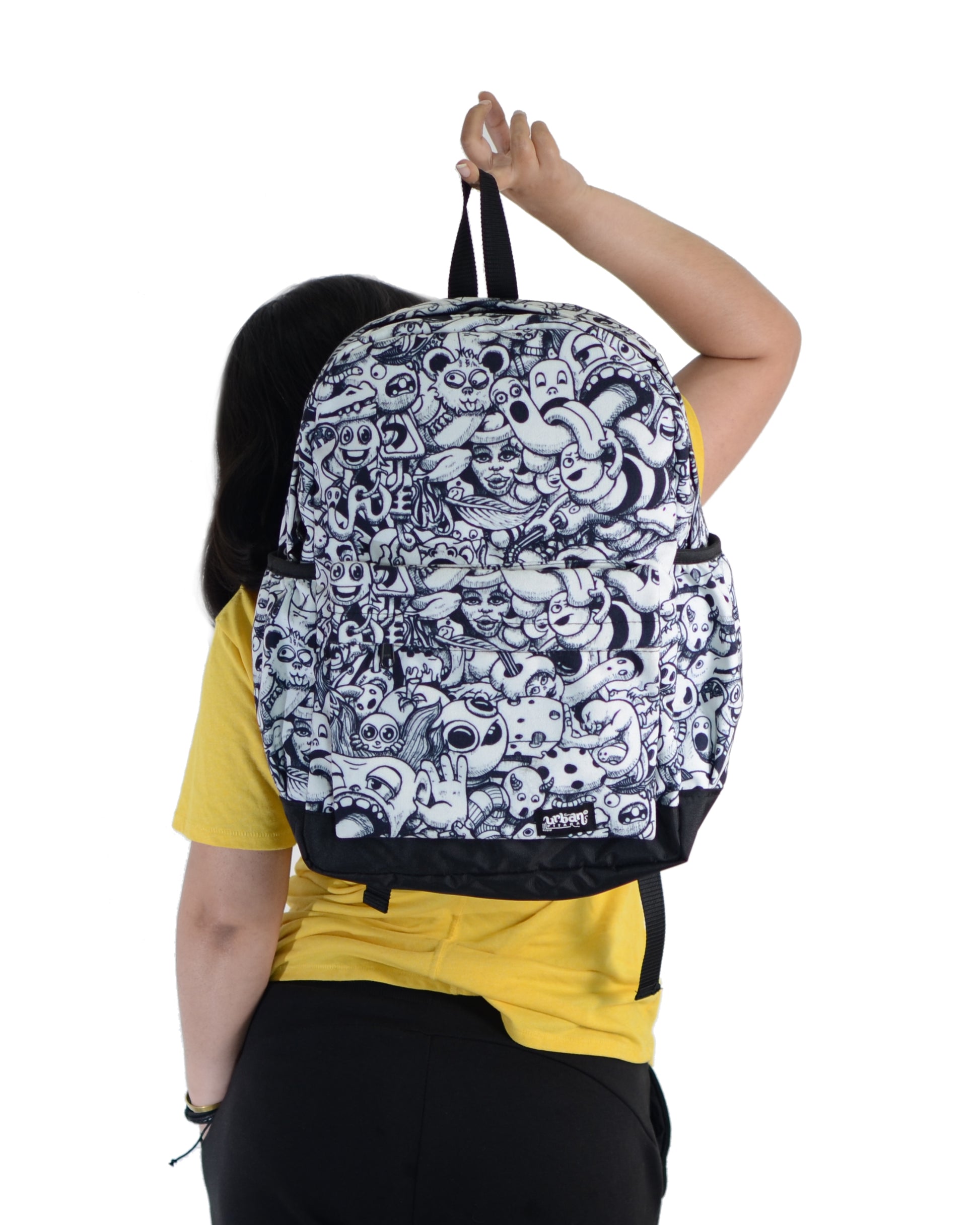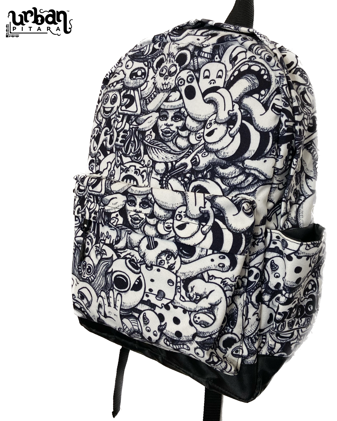 Urban Pitara Backpacks 1. Digitally Printed 2. Canvas Bags 3. Washable 4. With Laptop Sleeve inside 5. Bottle Holders on both sides 6. Size of bag is 18"x 16" x 4.5" (Size in inches) 7. Backside is Solid Black Colour NOTE: Internal images are for size reference only, print will be same as 1st picture.Urban Pitara Backpacks