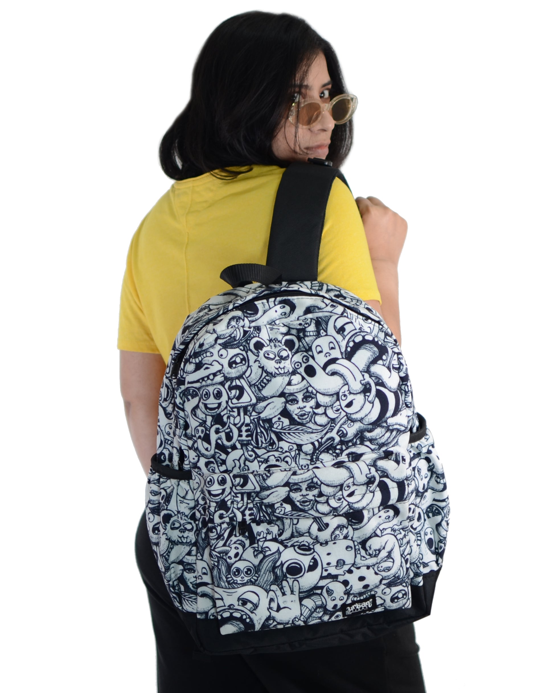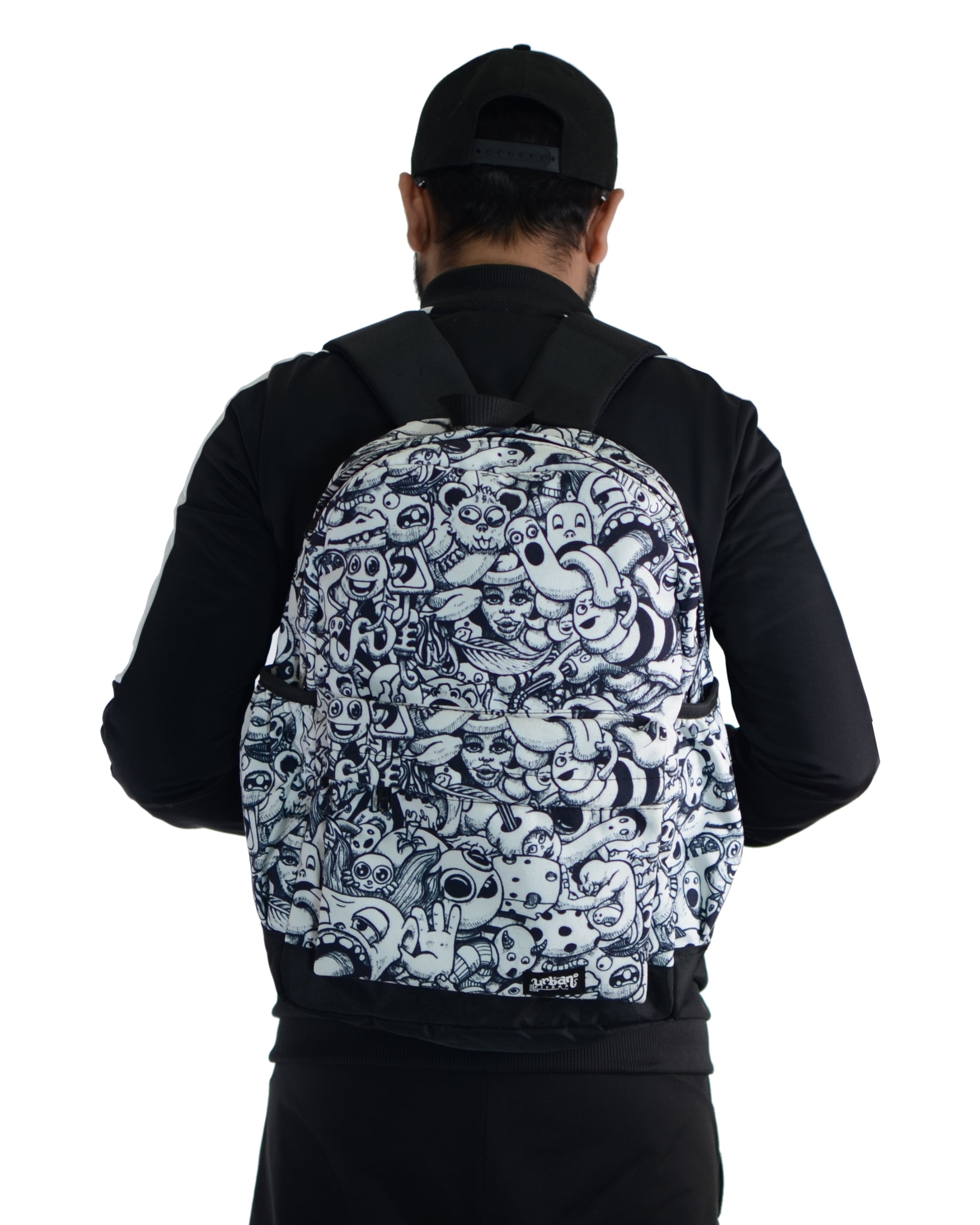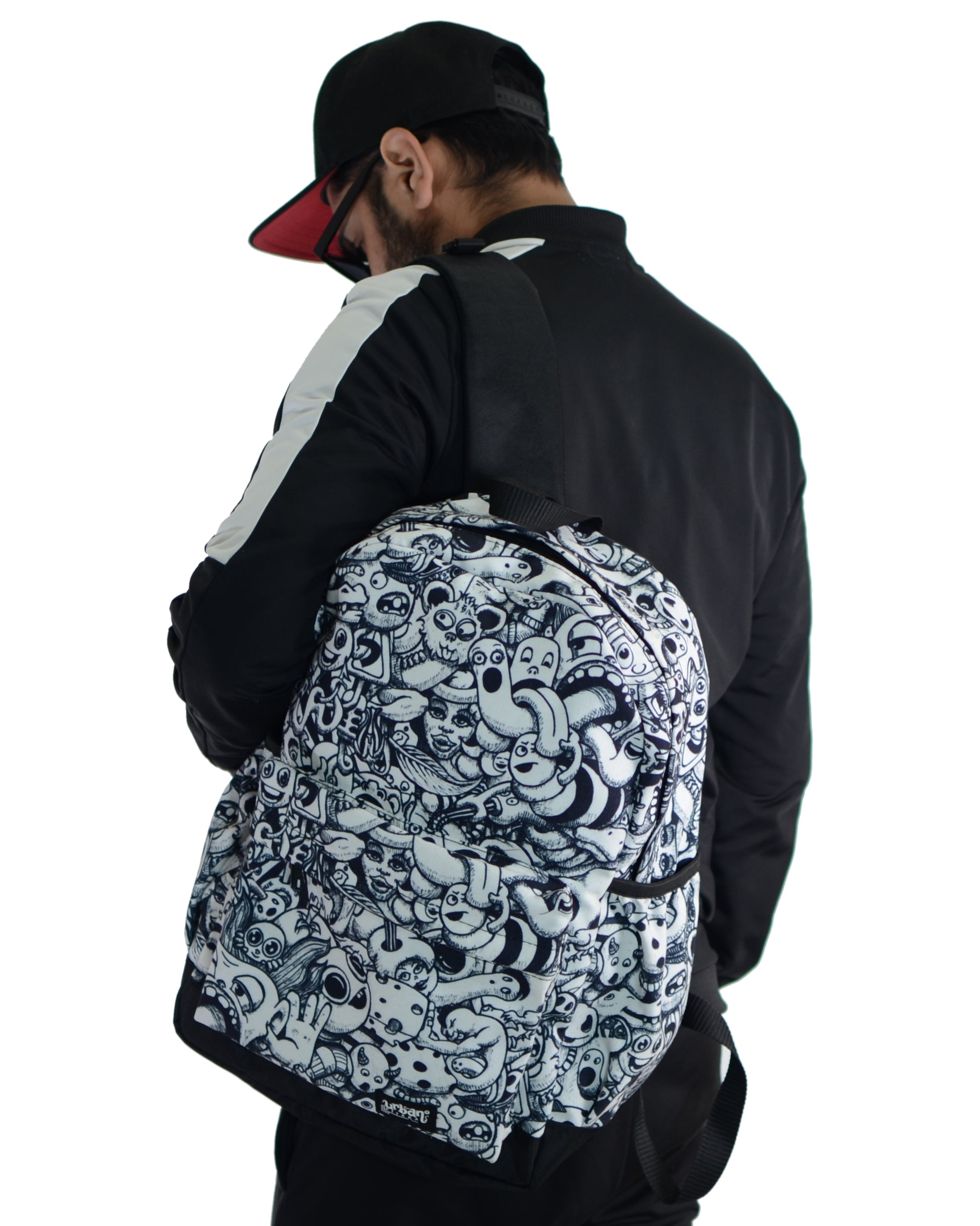 Urban Pitara Backpacks 1. Digitally Printed 2. Canvas Bags 3. Washable 4. With Laptop Sleeve inside 5. Bottle Holders on both sides 6. Size of bag is 18"x 16" x 4.5" (Size in inches) 7. Backside is Solid Black Colour NOTE: Internal images are for size reference only, print will be same as 1st picture.Urban Pitara Backpacks